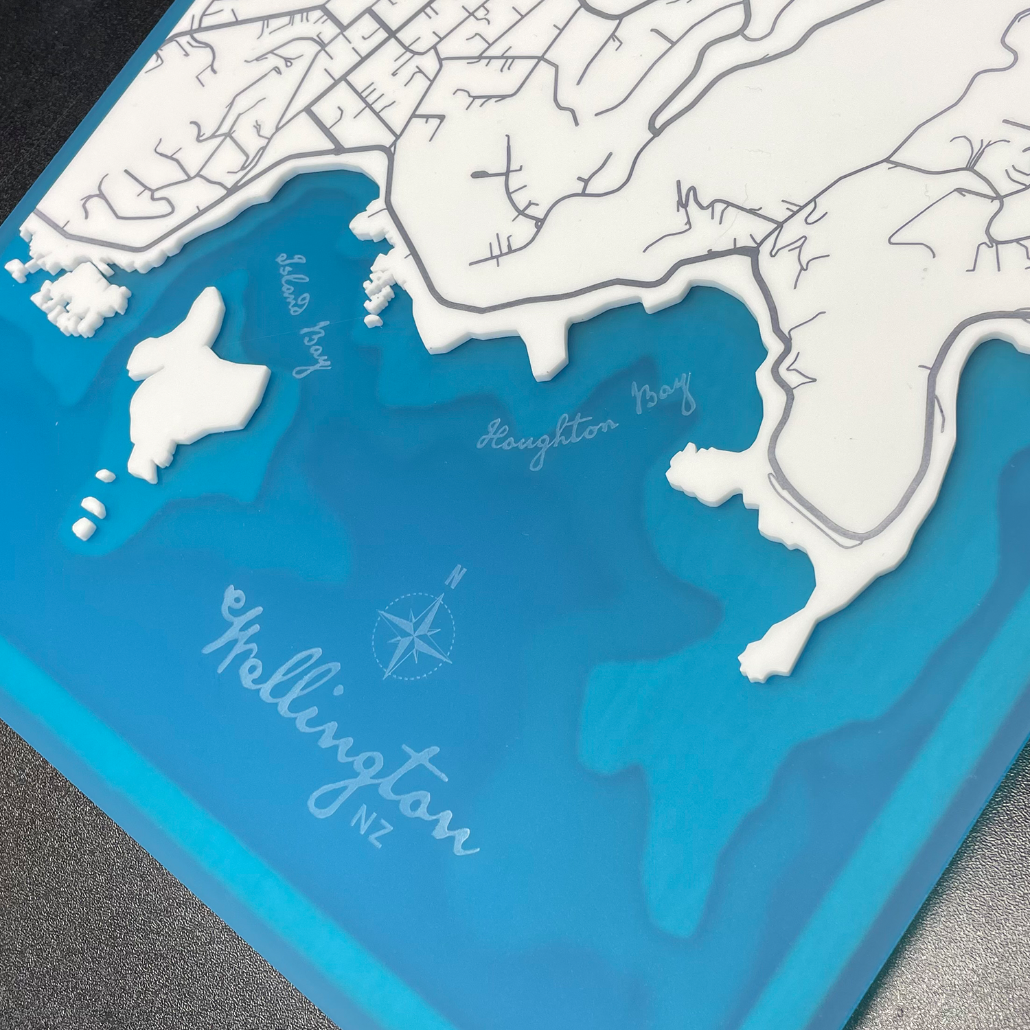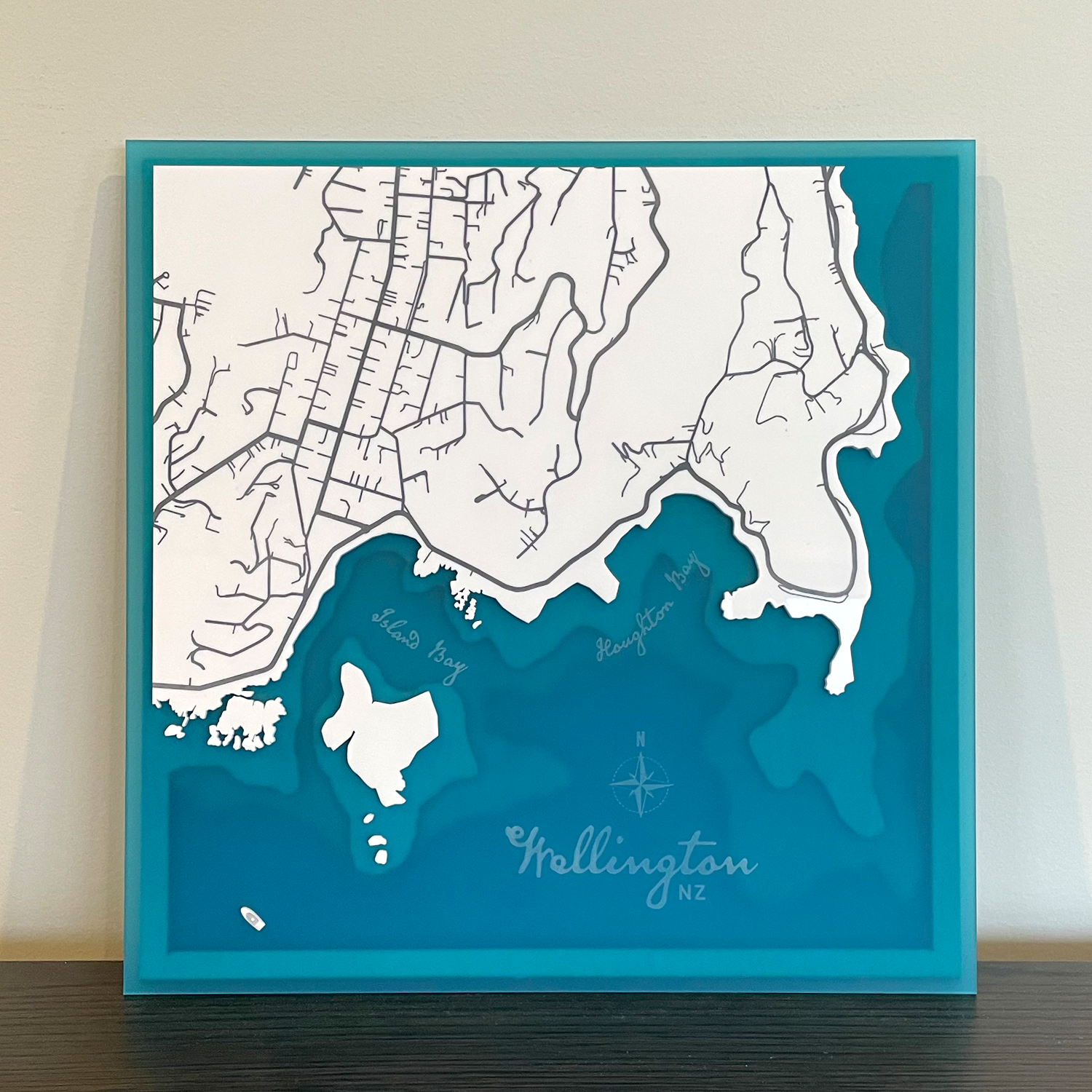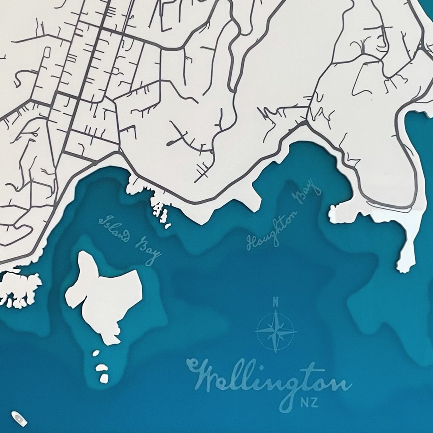 Designed and handcrafted in New Zealand, this bathymetric depth map captures the unique formation of a slice of the Wellington coastline – from Island Bay to Haughton Bay, including Taputeranga Island.