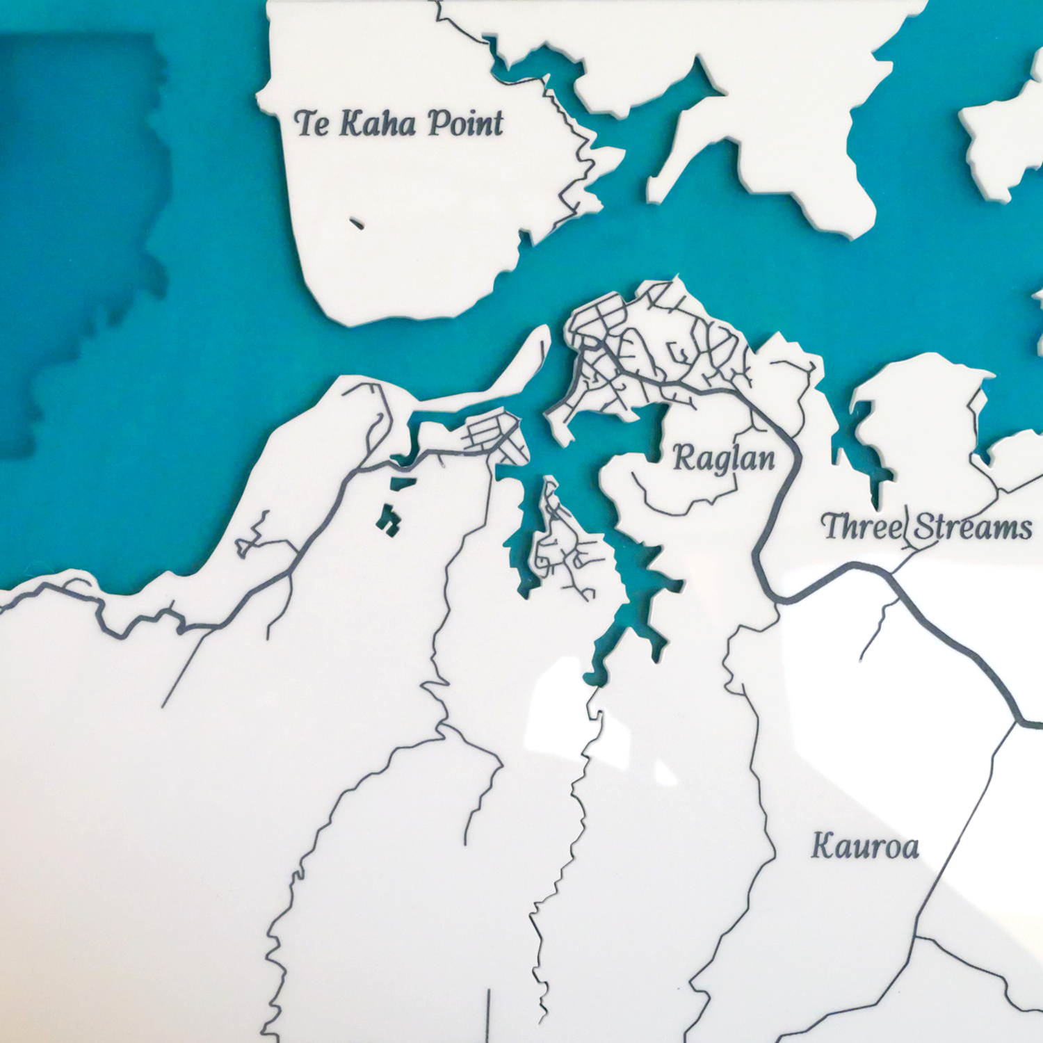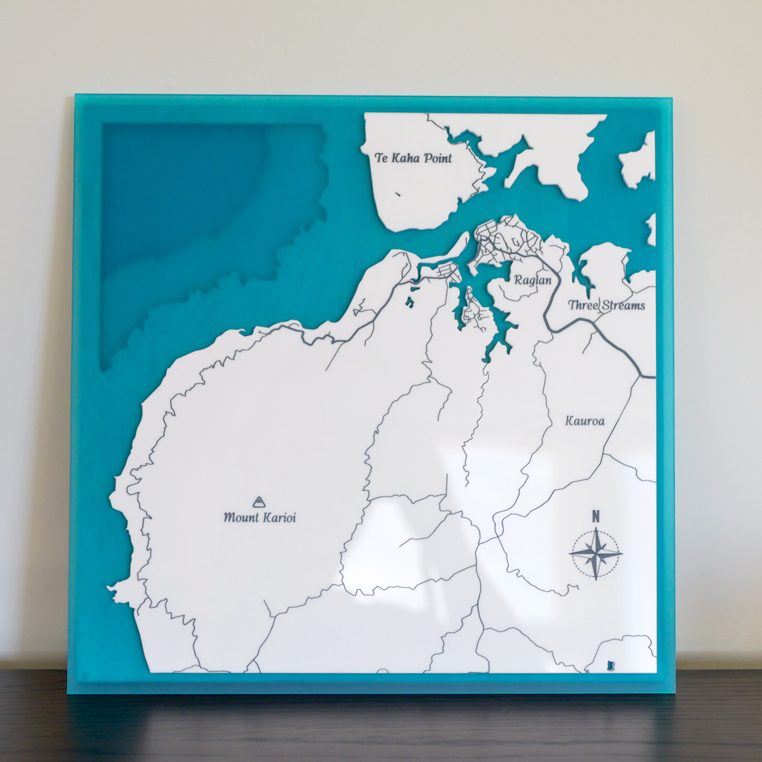 Handcrafted in New Zealand, this bathymetric depth map captures the unique formation of a slice of the Raglan coastline, including Te Kaha Point and Mount Karioi.