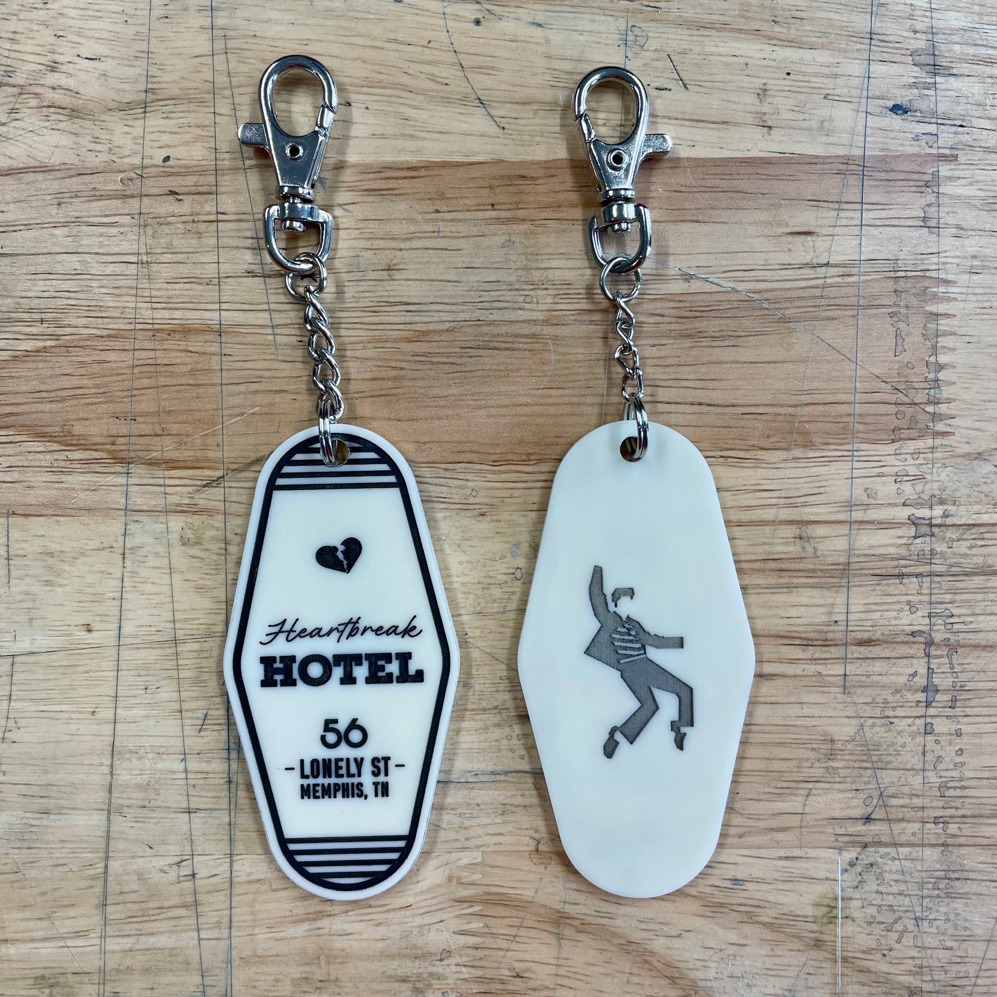 Unlock some retro charm with this motel-style keyring featuring a design celebrating the iconic Heartbreak Hotel song. Perfect for any Elvis fan or lover of quirky accessories, this keyring adds a touch of nostalgic charm to your everyday routine. Guaranteed to make your keys sing!