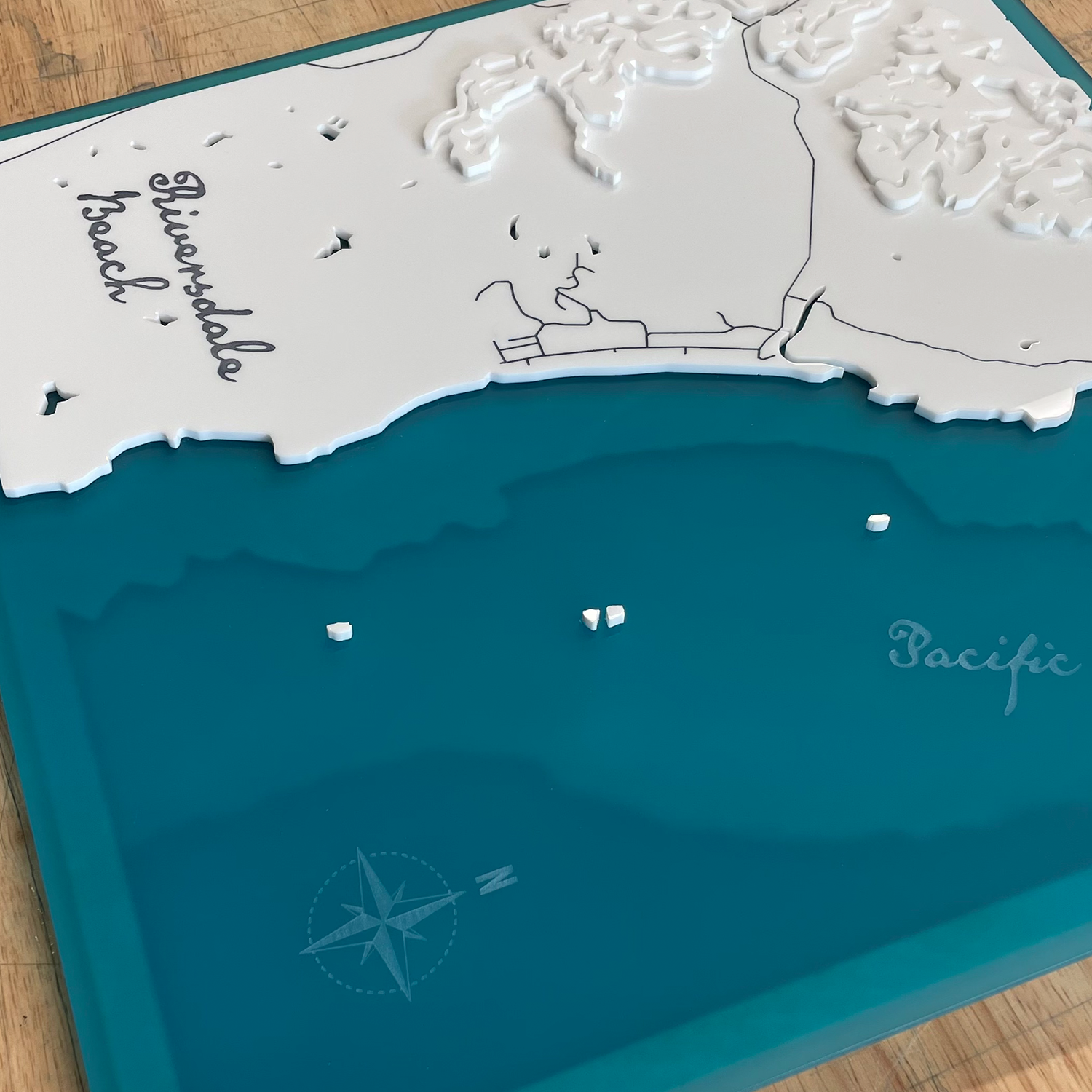 Designed and handcrafted in New Zealand, this bathymetric depth map captures the unique formation of the layers and shapes that make up the sleepy east coast town of Riversdale Beach.