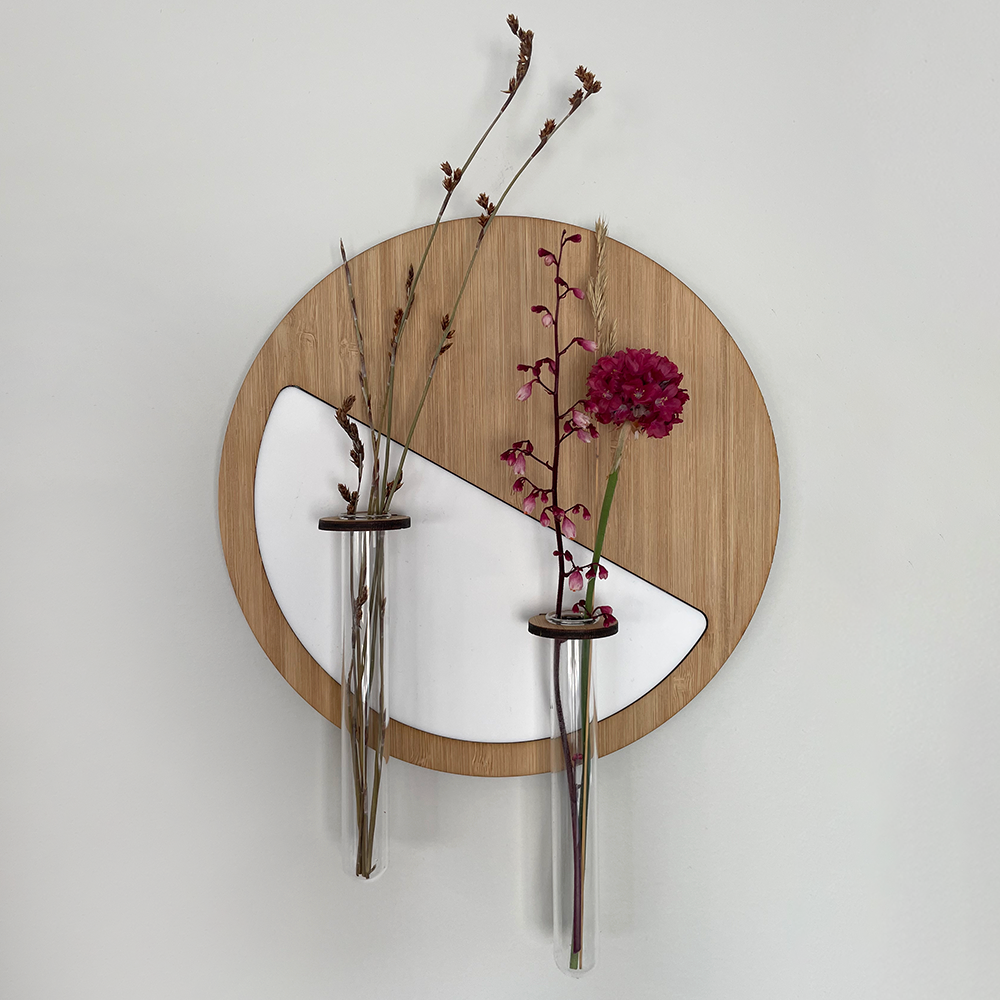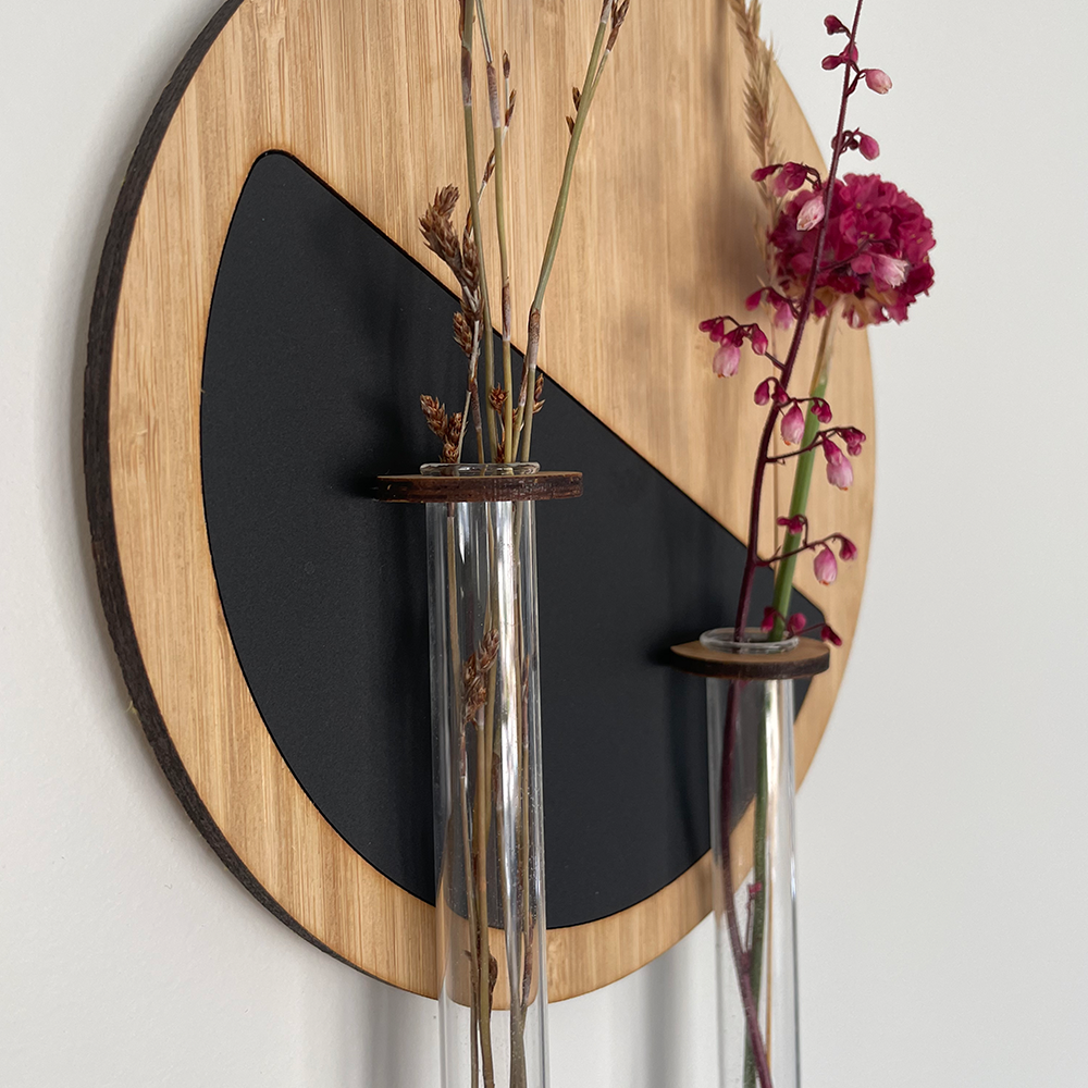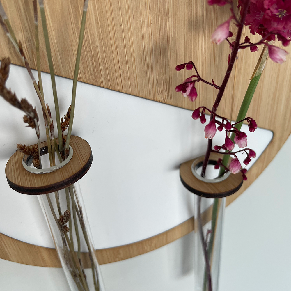 Add a touch of style to your home by showcasing your favorite flowers in this round test-tube vase wall hanging or propagation station. Made with a mix of bamboo and acrylic, this hanging is ideal for renters or those with limited space. Give your home decor a playful twist with this fun and modern piece today!
