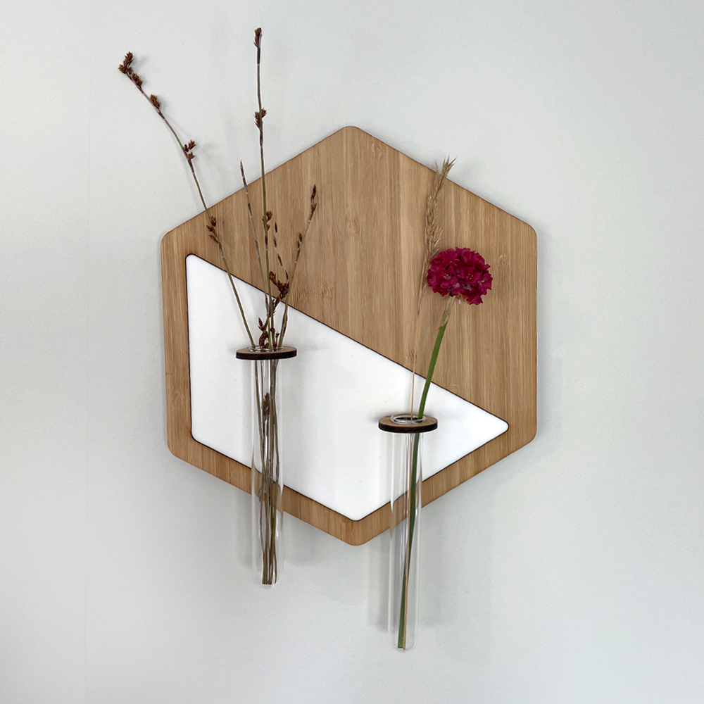 Elevate your floral game with this hexagonal vase wall hanging! Made from bamboo and acrylic, it's ideal for renters or small spaces. Add a playful touch to your home decor and be a trend-setter with this modern piece.